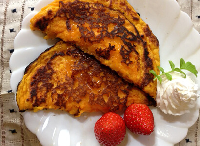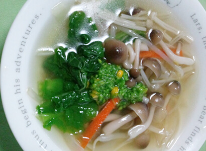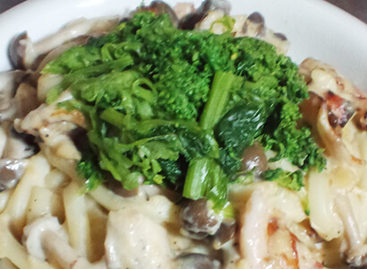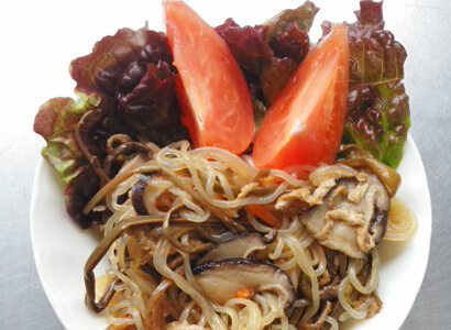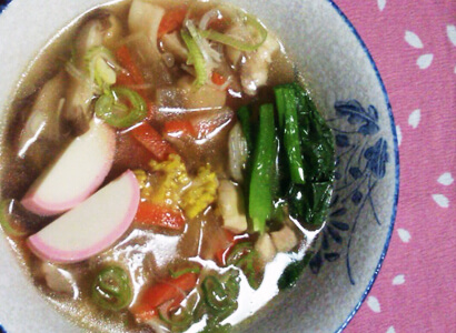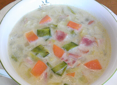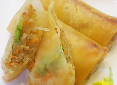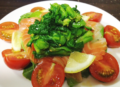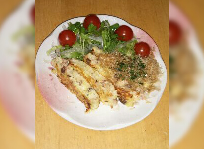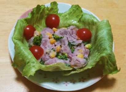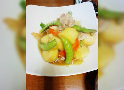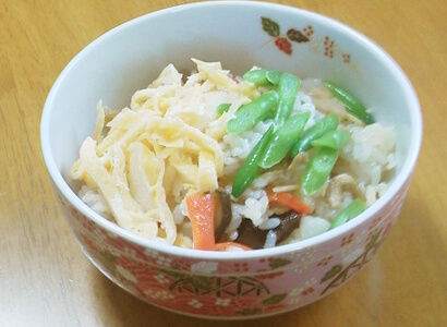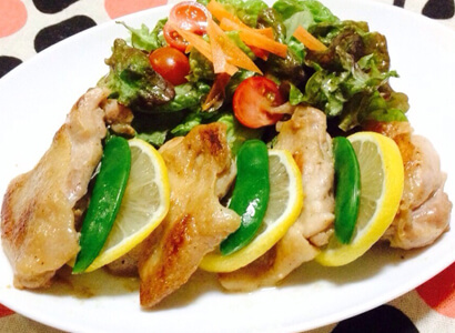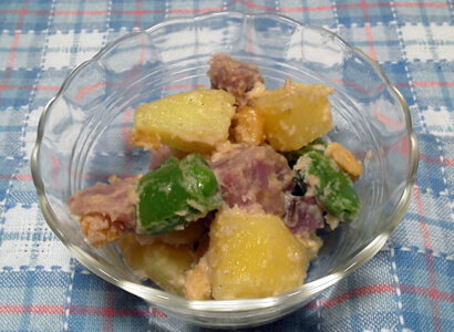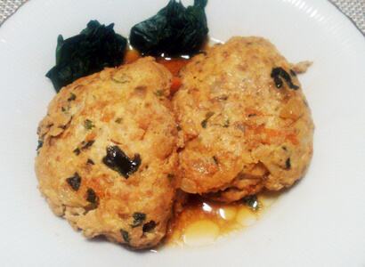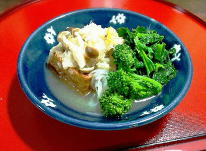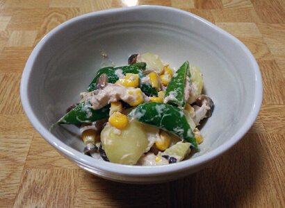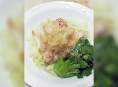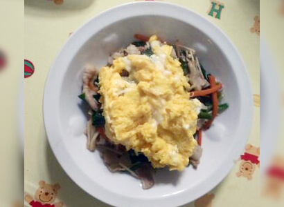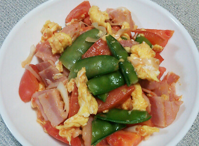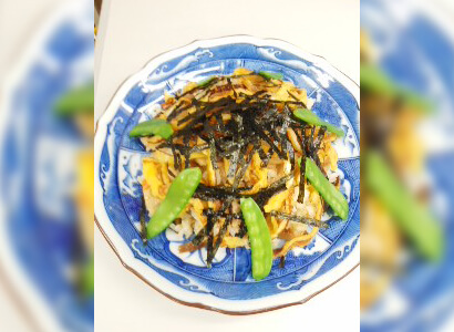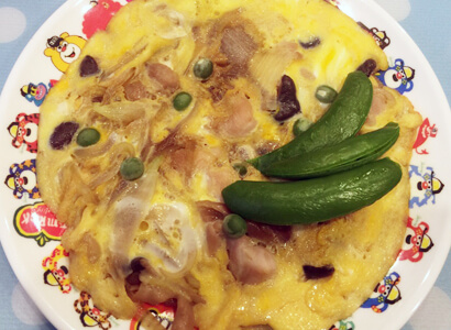 新玉葱と鶏肉の玉子とじとスナップエンドウ・にんじん団子天