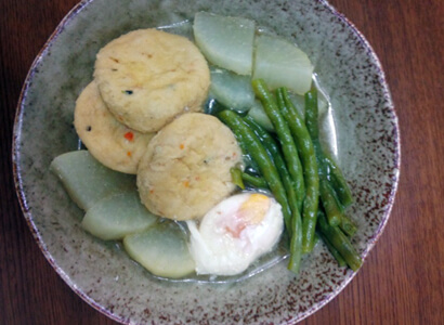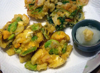 そら豆とゆで卵・えびと三つ葉のかき揚げ