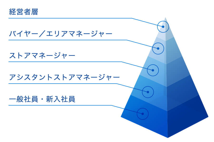 入社後はストアマネジャーを目指し、一歩ずつ成長してください。ストアマネジャー経験後、バイヤー職、エリアマネジャー職など、専門の職域に分かれていきます。